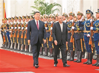 天安门广场鸣放21响礼炮,礼兵列队致敬。两国元首登上检阅台,军乐团奏中巴两国国歌。扎尔达里在习近平陪同下检阅中国人民解放军仪仗队,并观看分列式。