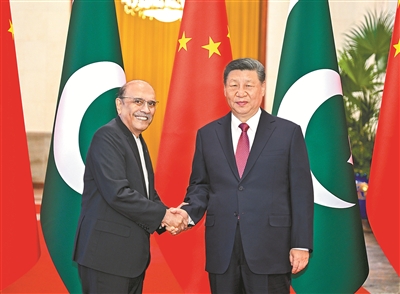 习近平指出,中国和巴基斯坦是铁杆朋友和全天候战略合作伙伴。历久弥坚的中巴传统友谊由两国老一辈领导人亲手缔造,是两国和两国人民的宝贵财富。近年来,双方坚定相互政治支持,保持密切高层交往,深入推进中巴经济走廊建设和各领域合作,树立了国与国关系典范。中方愿同巴方在各自现代化道路上携手前行,加快构建新时代更加紧密的中巴命运共同体,更好造福两国人民,为地区和平、稳定、繁荣作出更大贡献。
