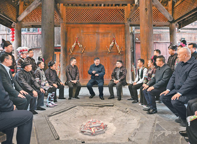 3月17日至18日,中共中央总书记、国家主席、中央军委主席习近平在贵州考察。这是17日下午,习近平在黔东南州黎平县肇兴侗寨考察时,在信团鼓楼同村干部和村民代表围坐在火塘边,共话乡村全面振兴。 |
