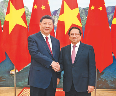 双方要推进高质量发展,为两国携手迈向现代化提供坚实战略支撑。充分发挥中越陆海相连的区位优势,加强发展战略对接,深挖产业合作潜能。稳步推进基础设施建设合作,提升互联互通水平,保障贸易畅通。做大做强贸易、投资等传统领域合作,拓展5G、人工智能、清洁能源、数字经济等新兴产业合作。坚定维护多边贸易体制,共同推动经济全球化朝着更加开放、包容、普惠、均衡的方向发展。