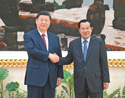 习近平指出,中柬两国是友好邻邦,更是铁杆朋友。构建中柬命运共同体是历史的选择、人民的选择。当前,中柬两国都处在国家发展的关键阶段,双方要心系人民福祉,胸怀人类进步,在推进各自现代化进程中,为构建人类命运共同体树立典范,携手做世界百年变局中的和平力量、稳定力量、进步力量。