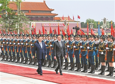 四月二十三日上午,国家主席习近平在北京人民大会堂同来华进行国事访问的阿塞拜疆总统阿利耶夫举行会谈。这是会谈前,习近平在人民大会堂东门外广场为阿利耶夫举行欢迎仪式。 |
